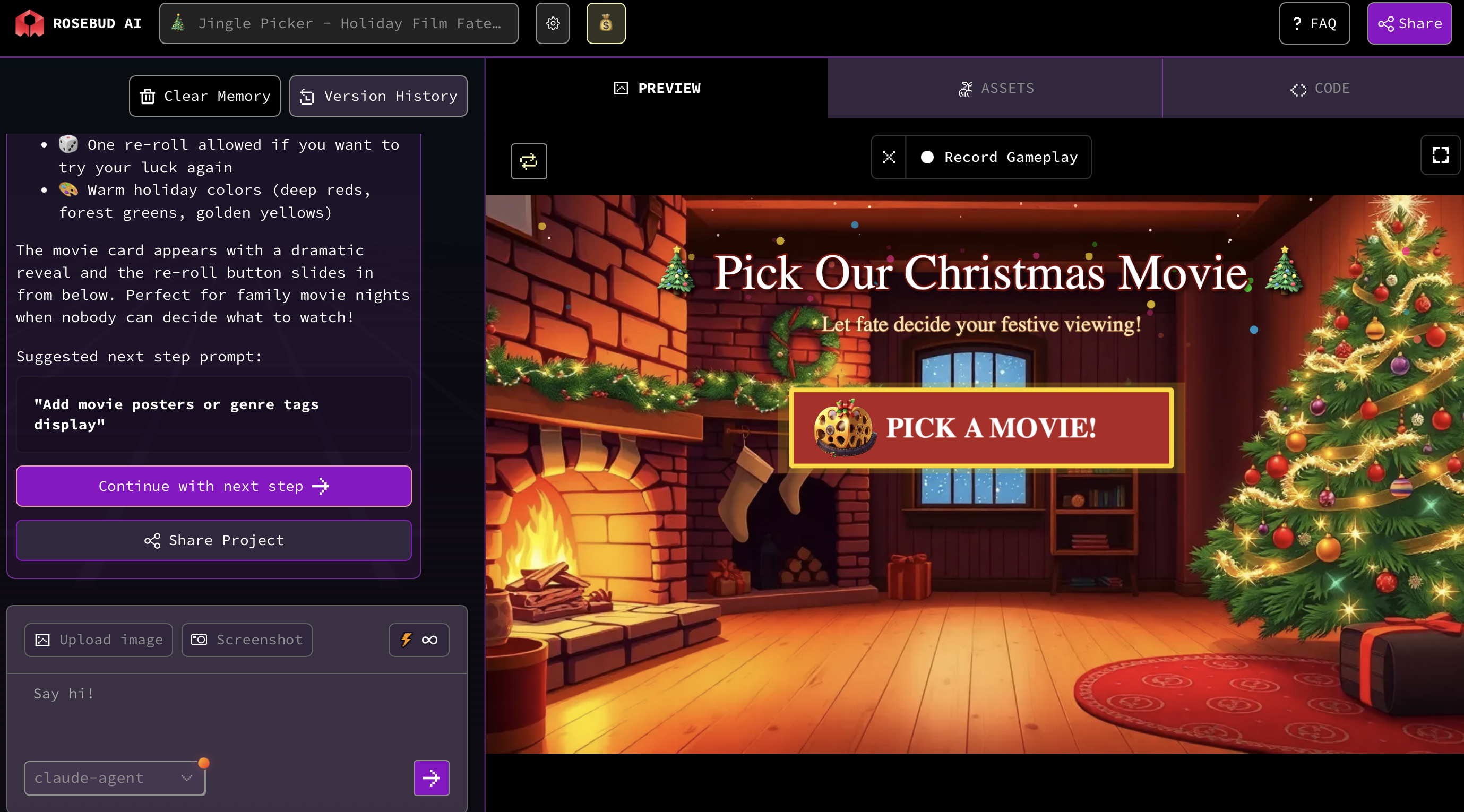 “Create a Christmas Movie Randomizer game with a festive UI. When the user clicks a button, randomly select a Christmas movie from a predefined list and display it with animations and sound effects.” - Customize: