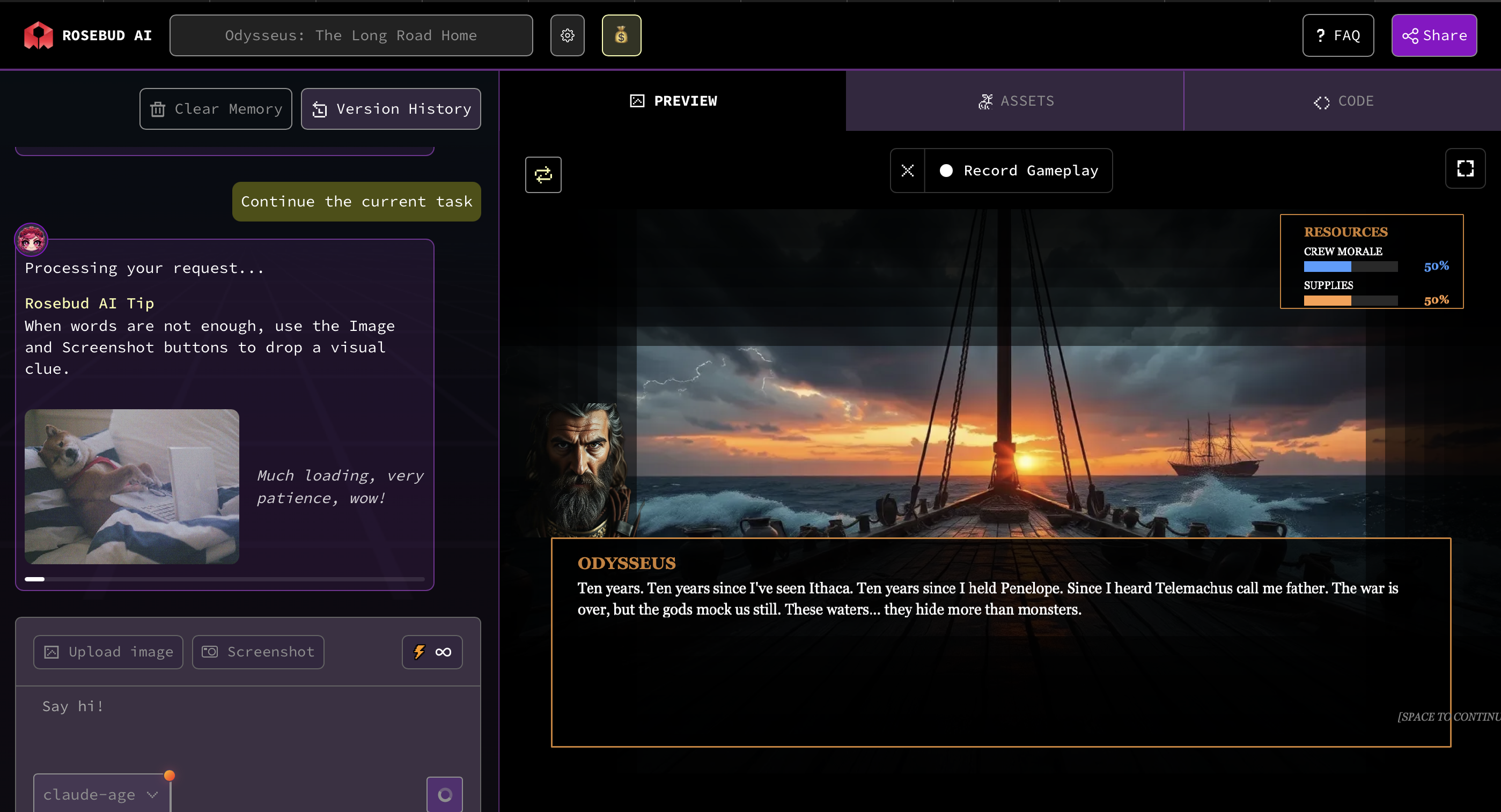 Rosebud AI lets anyone build games without coding — ideal for a cinematic, narrative-driven Odyssey experience.